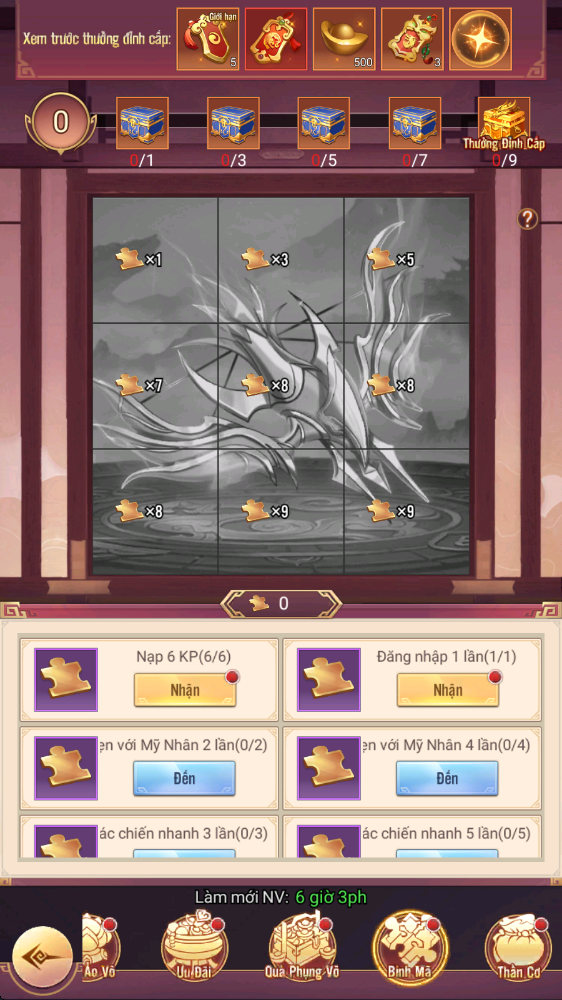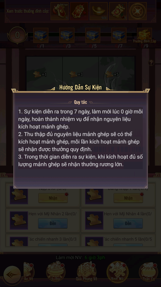 - Hình thức: Hoàn thành nhiệm vụ để thu thập nguyên liệu ghép tranh, khi kích hoạt đủ số lượng mảnh ghép sẽ nhận phần thưởng tương ứng