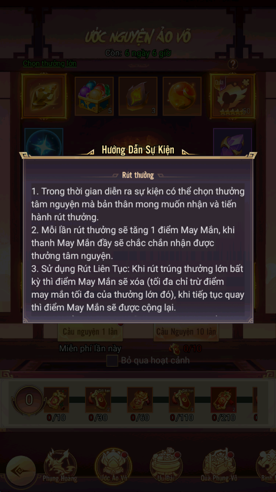 - Hình thức: Sử dụng Lệnh Ước Nguyện để rút thưởng cao cấp, người chơi có thể tùy ý thay đổi phần thưởng mục tiêu trong quá trình rút; khi đạt số lượt rút nhất định sẽ nhận thêm phần thưởng tương ứng