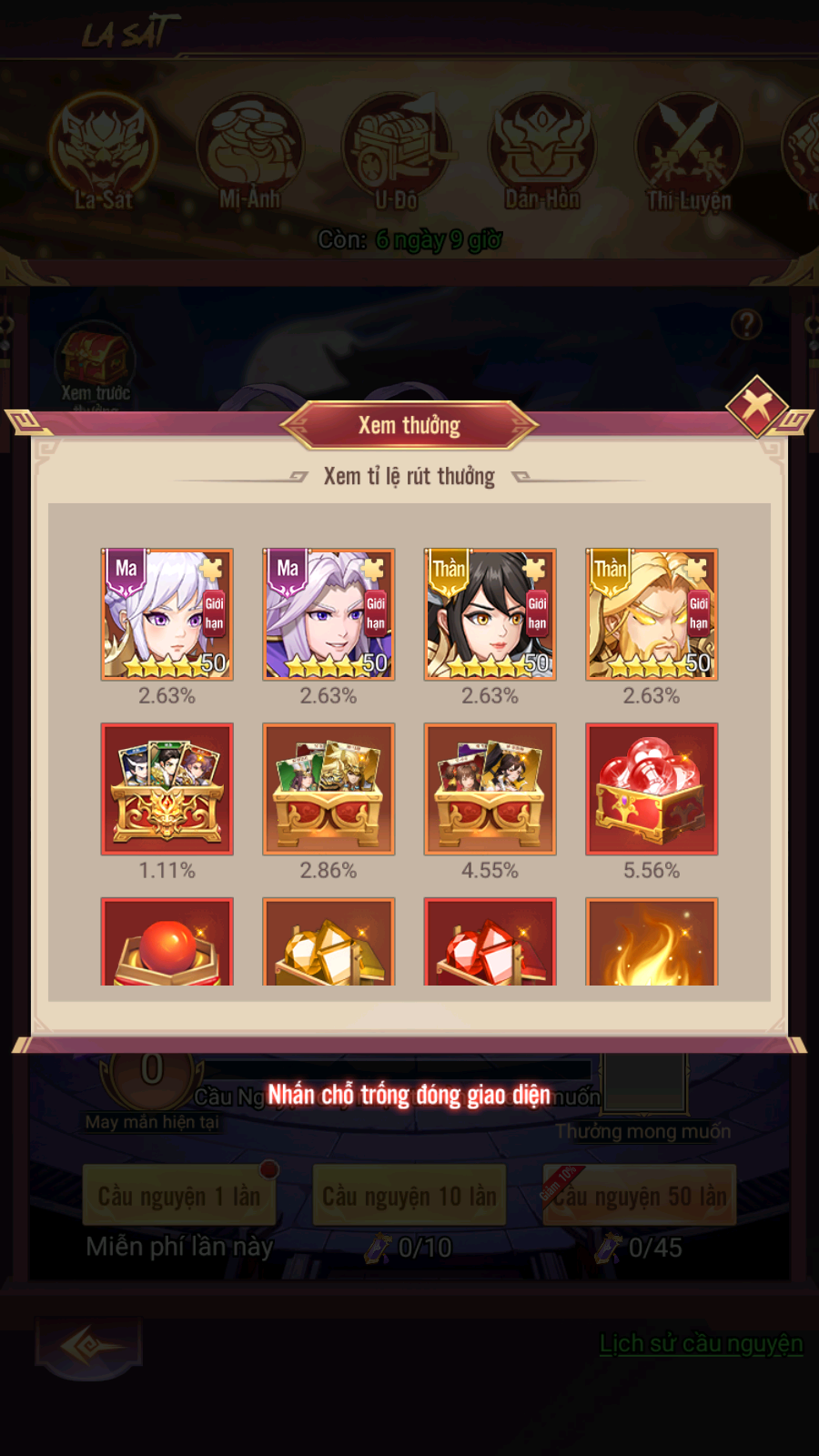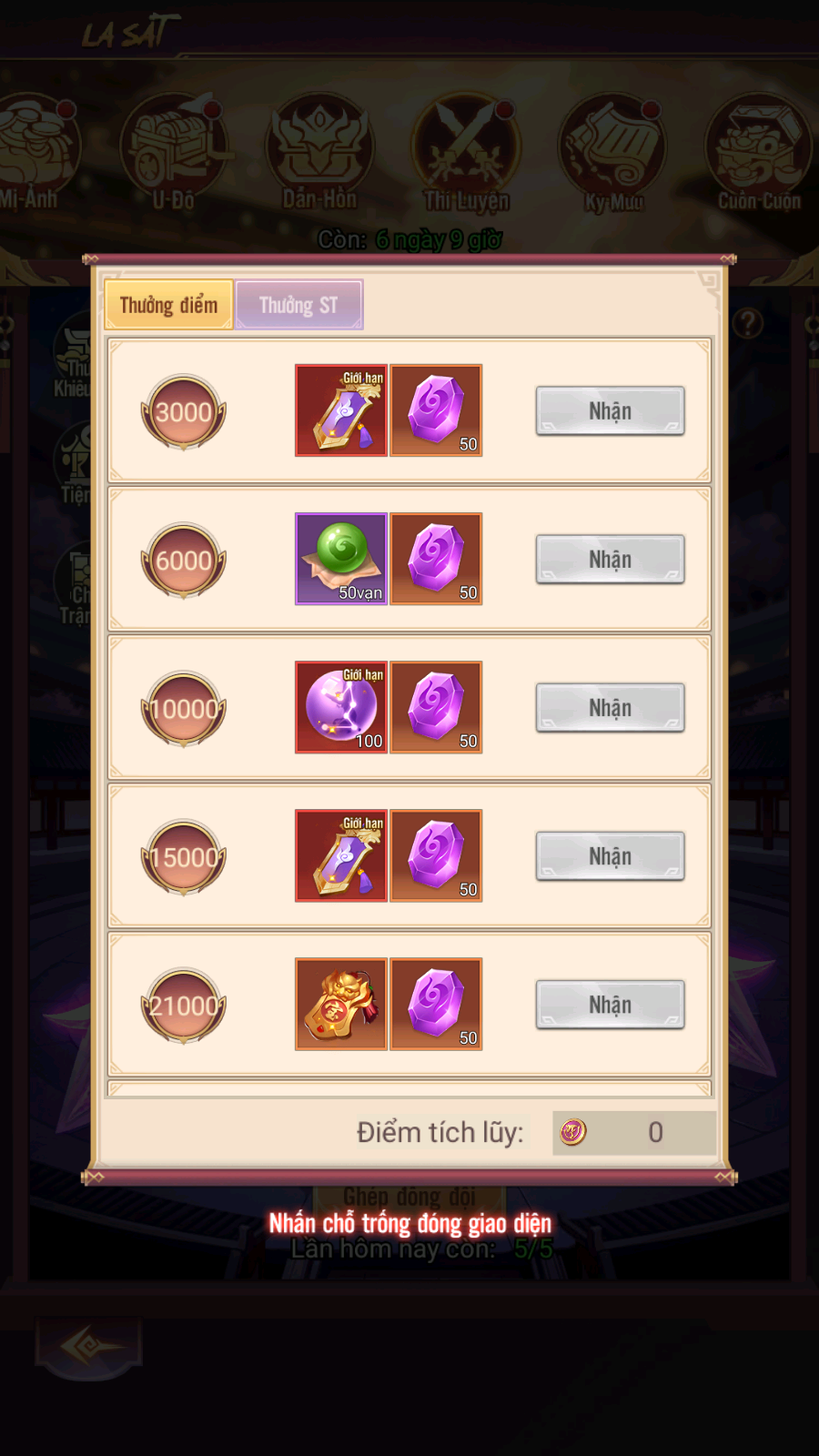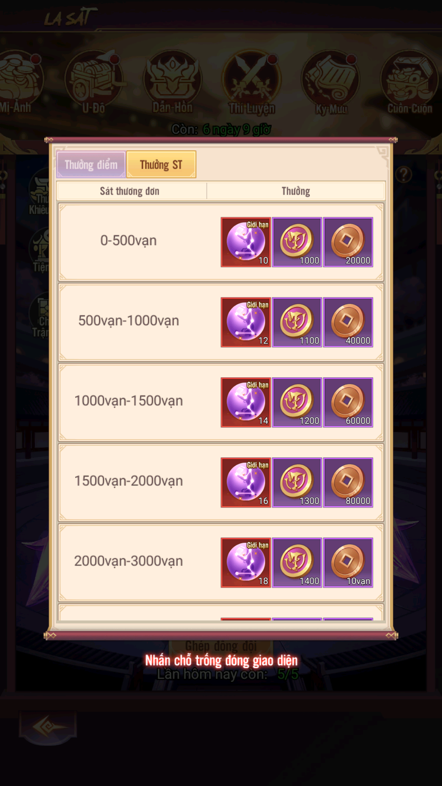 - Thưởng: Mật Lệnh La Sát, Thần Thạch Phú Hồn, Rương Tự Chọn Đỉnh Cấp...