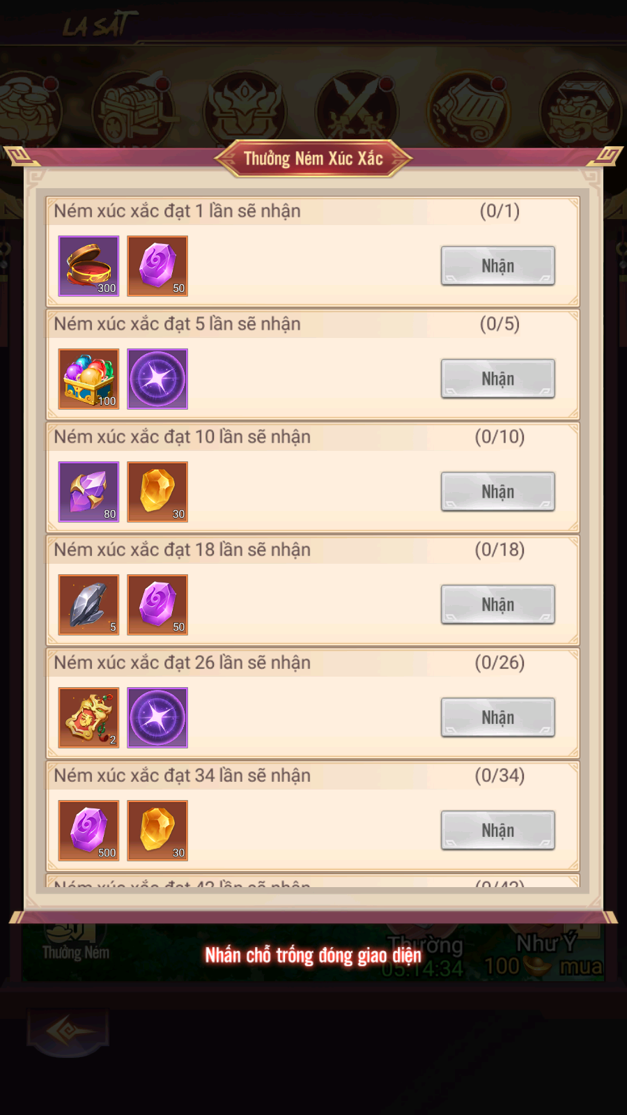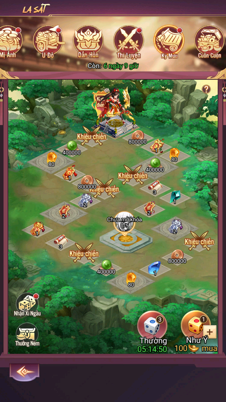 - Hình thức: Lắc xúc xắc nhận thưởng, khiêu chiến lính canh và boss. Đạt số lần lắc nhất định sẽ nhận thưởng. Xúc xắc thường nhận qua nhiệm vụ hoặc hồi theo thời gian, Xúc xắc Như Ý có thể mua bằng KNB