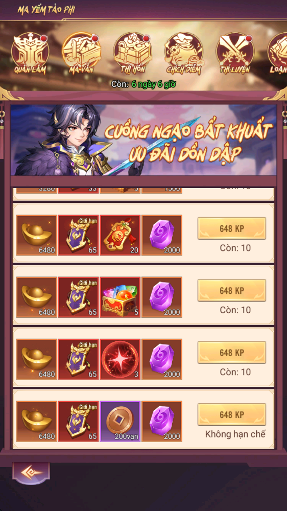 - Thưởng: Rương Tự Chọn Nguyên Liệu Hiếm 4, Lệnh Chiêu Hiền, Lệnh Chiêu Mộ Cao Cấp...