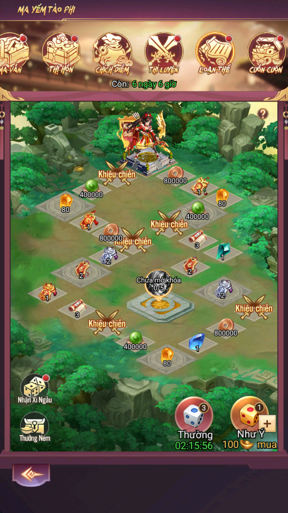- Hình thức: Tham gia lắc xí ngầu để nhận thưởng và khiêu chiến Thủ Vệ & Boss. Lắc xí ngầu đạt mốc nhất định để nhận thêm phần thưởng. Xí ngầu thường nhận qua nhiệm vụ và hồi theo thời gian. Xí ngầu như ý mua bằng KNB.