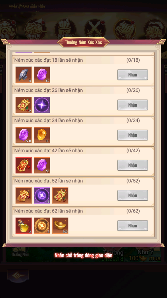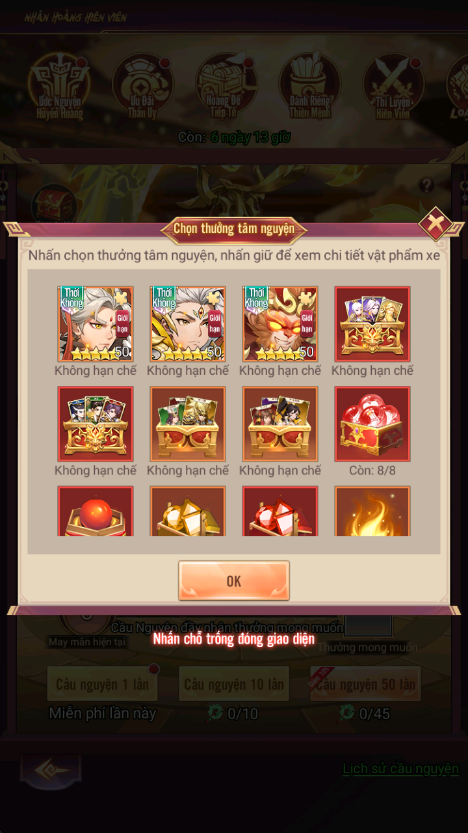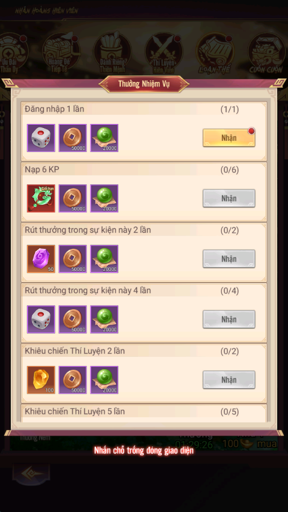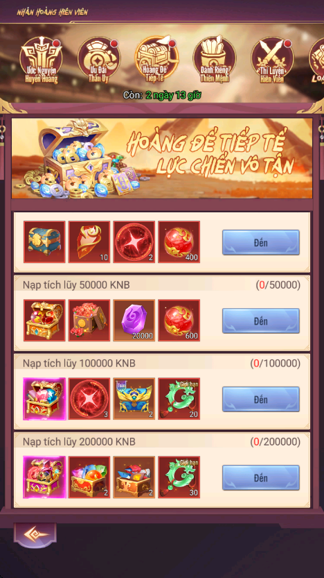 - Thưởng: Chiếu Lệnh Nhân Hoàng, Lệnh Đoạt Bảo Cao Cấp, KNB...