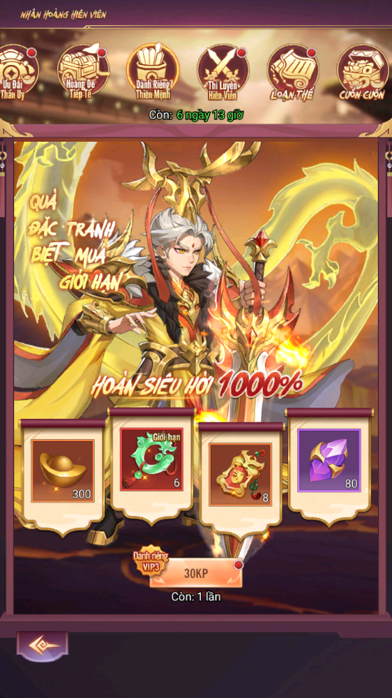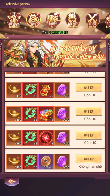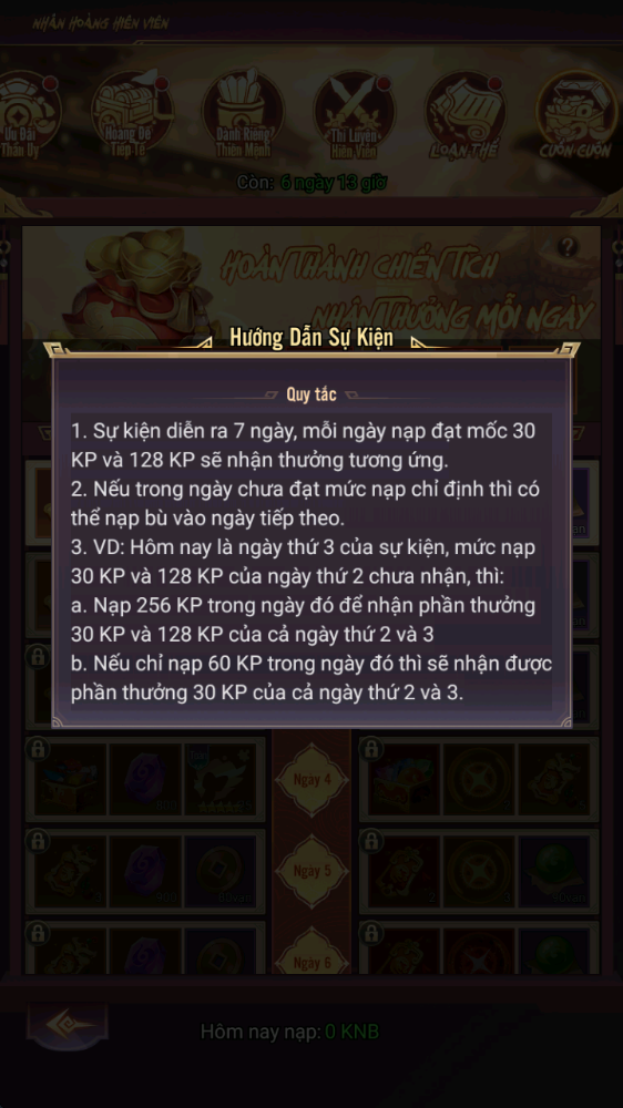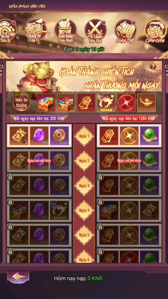 - Thưởng: Rương Tự Chọn Nguyên Liệu Hiếm 4, Lệnh Chiêu Hiền, Lệnh Chiêu Mộ Cao Cấp...