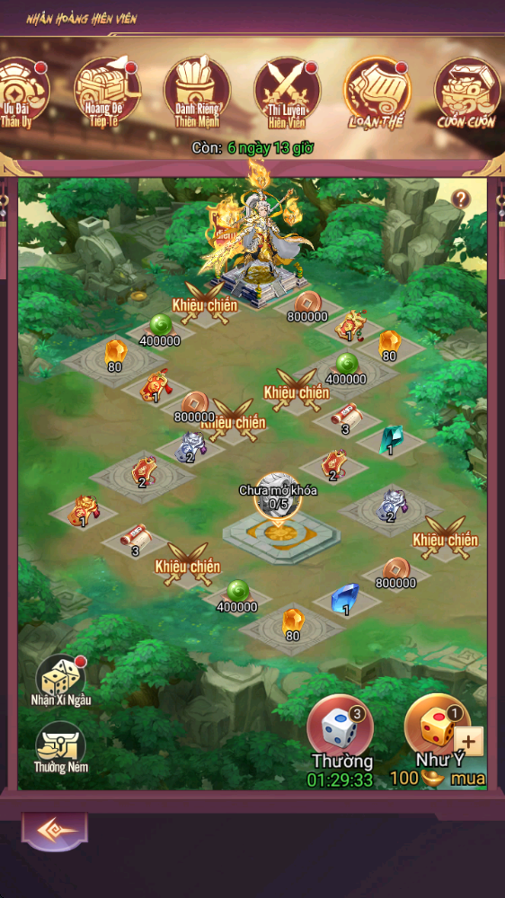 - Hình thức: Tham gia lắc xí ngầu để nhận thưởng và khiêu chiến Thủ Vệ & Boss. Lắc xí ngầu đạt mốc nhất định để nhận thêm phần thưởng. Xí ngầu thường nhận qua nhiệm vụ và hồi theo thời gian. Xí ngầu như ý mua bằng KNB.
