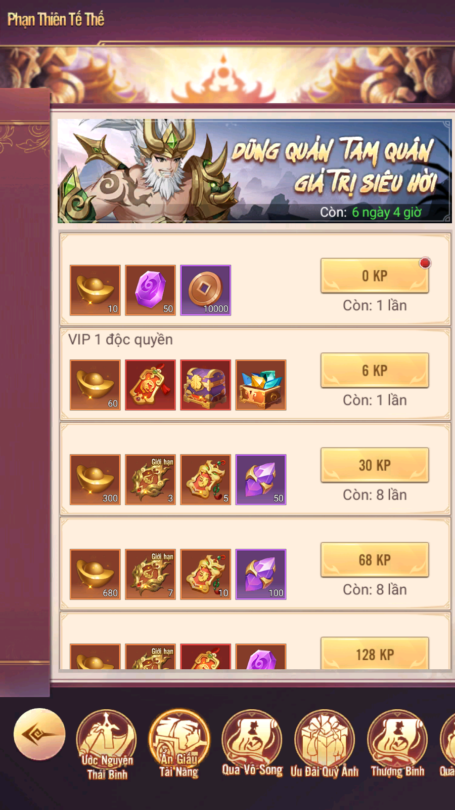 - Hình thức: Mua các gói quà mua ngay theo các mốc giá