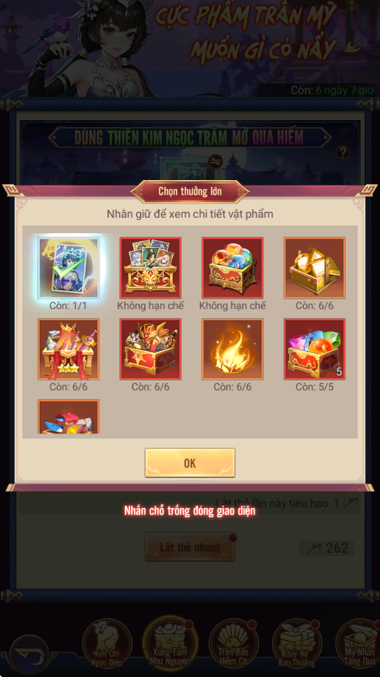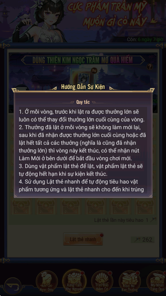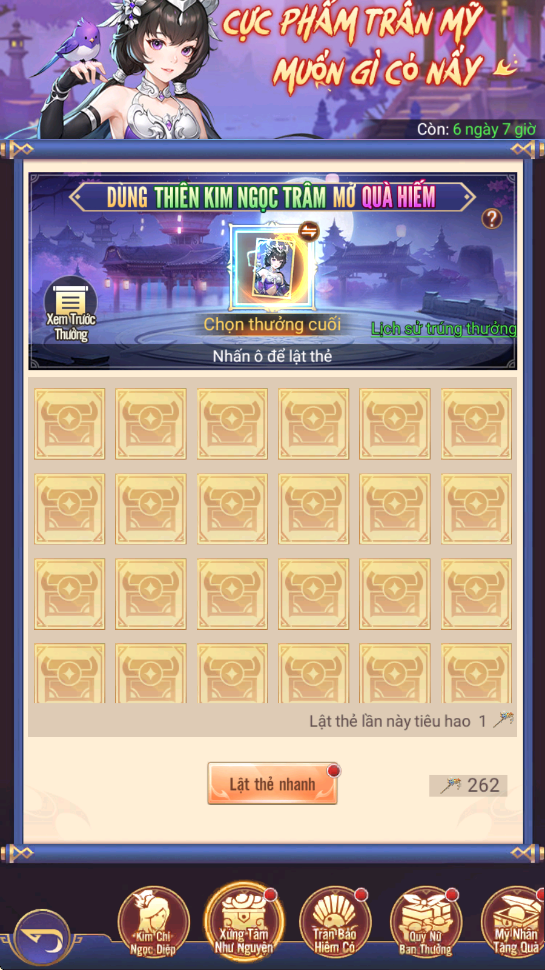 - Hình thức: Dùng Ngọc Trâm Thiên Kim để lật thẻ rút phần thưởng cao cấp, có thể tùy ý lựa chọn phần thưởng cao cấp khác để quay
