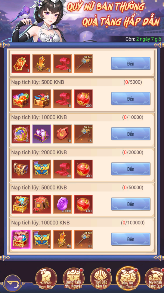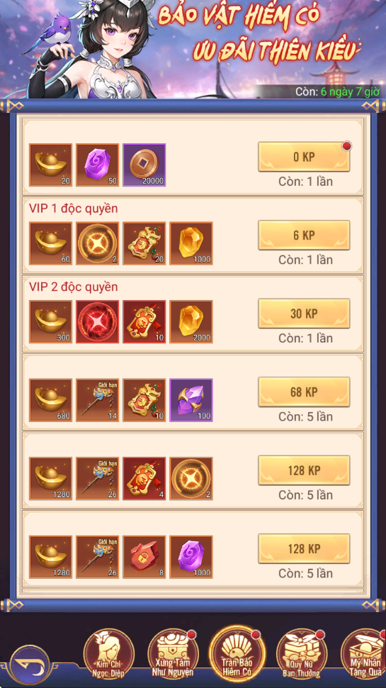 - Thưởng: Ngọc Trâm Thiên Kim, Lệnh Chiêu Hiền, KNB...