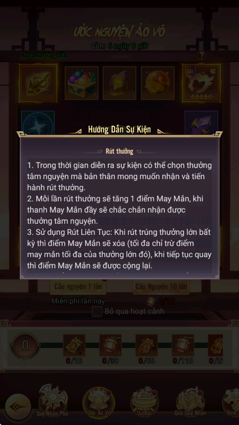 - Hình thức: Sử dụng Đèn Ước Nguyện để rút phần thưởng cao cấp, có thể tùy ý chuyển đổi phần thưởng để quay lại; khi quay đạt số lượt nhất định sẽ nhận thêm phần thưởng tương ứng