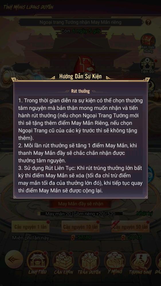 - Hình thức: Sử dụng Chiếu Lệnh Linh Tiêu để rút thưởng cao cấp, có thể tùy ý thay đổi phần thưởng mục tiêu; khi đạt số lần rút nhất định sẽ nhận thêm thưởng tương ứng
