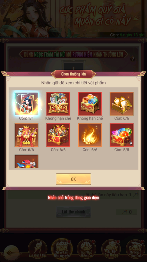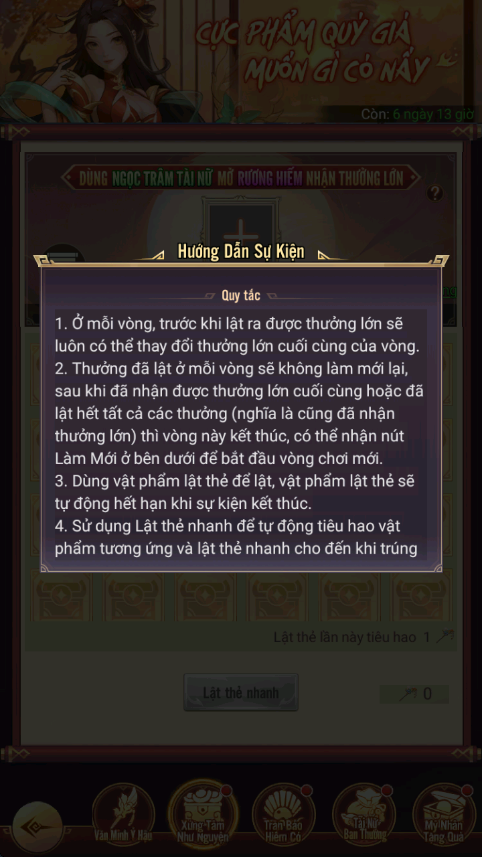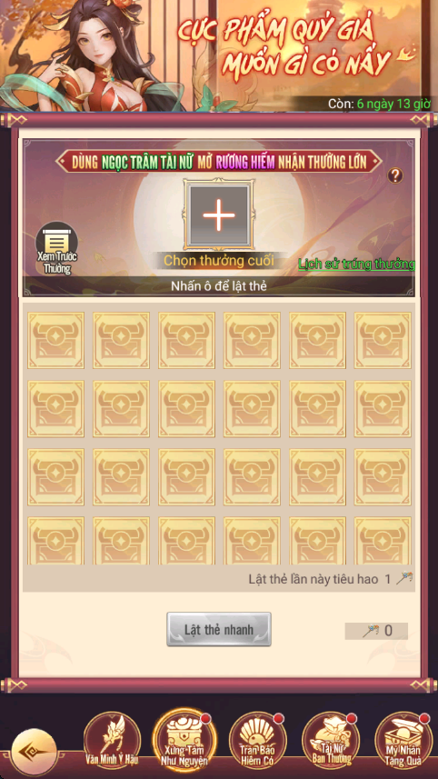 - Hình thức: Dùng Ngọc Trâm Hoàng Hậu để lật thẻ rút phần thưởng cao cấp, có thể tùy ý lựa chọn phần thưởng cao cấp khác để quay