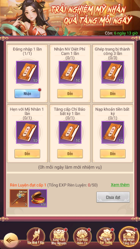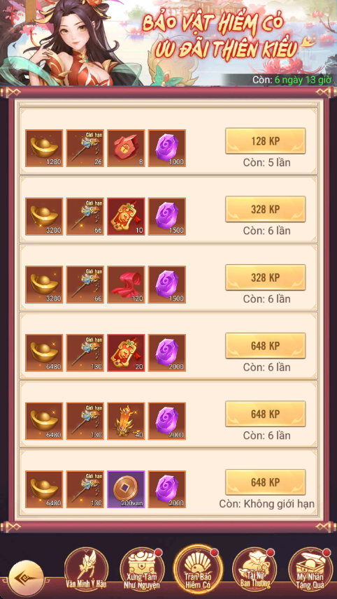 - Thưởng: Mỹ Nhân - Vương Nguyên Cơ, Tự Chọn Linh Thạch Cấp 4...